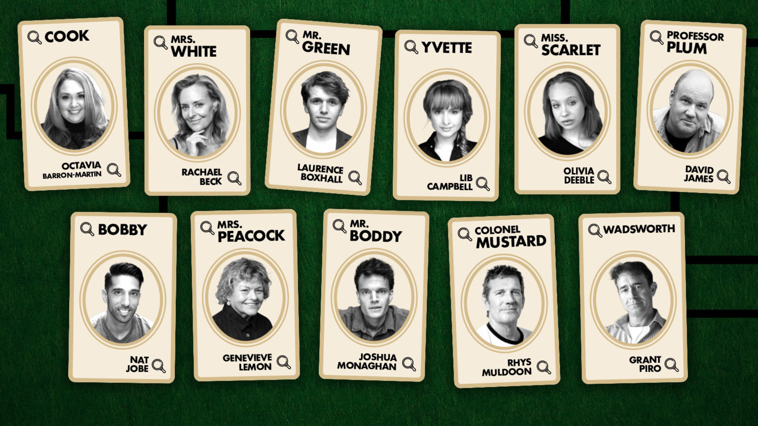 The cast for the game of whodunnit that’s gripped generations will include Octavia Barron Martin (Les Misérables) as the Cook, Rachael Beck (Beauty and the Beast, The Sound of Music) as Mrs White, Laurence Boxhall (Agatha Christie’s The Mousetrap) as Mr Green, Lib Campbell (The 39 Steps) as Yvette, Olivia Deeble (Home & Away, Little Lunch) as Miss Scarlet, David James (Sound of Music, Muriel’s Wedding) as Professor Plum, Nat Jobe (Shrek the Musical, Aladdin) as Bobby, Genevieve Lemon (The Piano, Sister Act), as Mrs Peacock, Joshua Monaghan (Bell Shakespeare’s Coriolanus) as Mr Boddy, Rhys Muldoon (House Husbands, Rake) as Colonel Mustard, and Grant Piro (Agatha Christie’s And Then There Were None) in the role of Wadsworth.